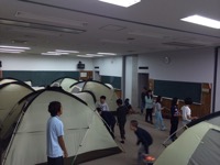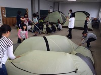 あいにくの雨のため、室内にテントを張って寝ます。