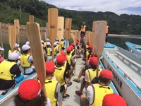 今からマリン活動で、ペーロン艇に乗ります。みんなで力を合わせて漕ぎます。いざ、出航!!