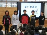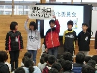 朝の時間に児童集会を行いました。全員で、今月の歌を歌った後、美化委員会の発表がありました。掃除前に行っている「黙想」について、なぜ行っているかを例を示したり、実際の様子を映像で見てもらったりして、意味を説明してくれました。最後に、感想交流では「しっかりと黙想をして、自分を高めていきたいと思いました。」などがありました。