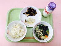 牛乳、麦ご飯、すまし汁、いわしの梅煮、かみかみするめあえ
