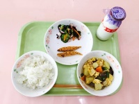 今日の献立には「めざし」があります。「めざし」とは、いわしを塩水につけた後、干したものです。たんぱく質や脂質、ビタミン類やカルシウムを多く含んでいます。噛みごたえのある食品なのでよく噛んで食べてくださいね。