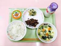 今日の給食には、みなさんに人気の「鶏のからあげ」があります。給食センターでしょうゆ、にんにく、塩・こしょうで味付けをして作りました。また、みそ汁に入っている白菜は、大部分は水分ですが、ビタミンCが多く、風邪の予防や免疫力アップに効果的です。今日の給食もよく噛んで残さず食べてくださいね。