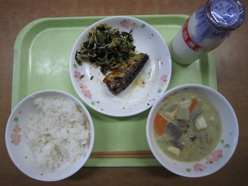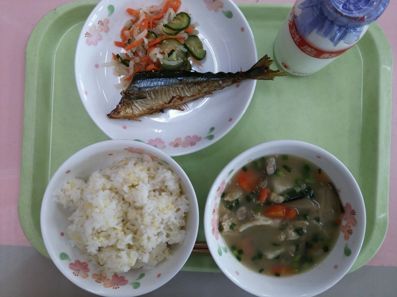 牛乳、さんごくめし、サンマの塩焼き、なます、いきなり団子汁