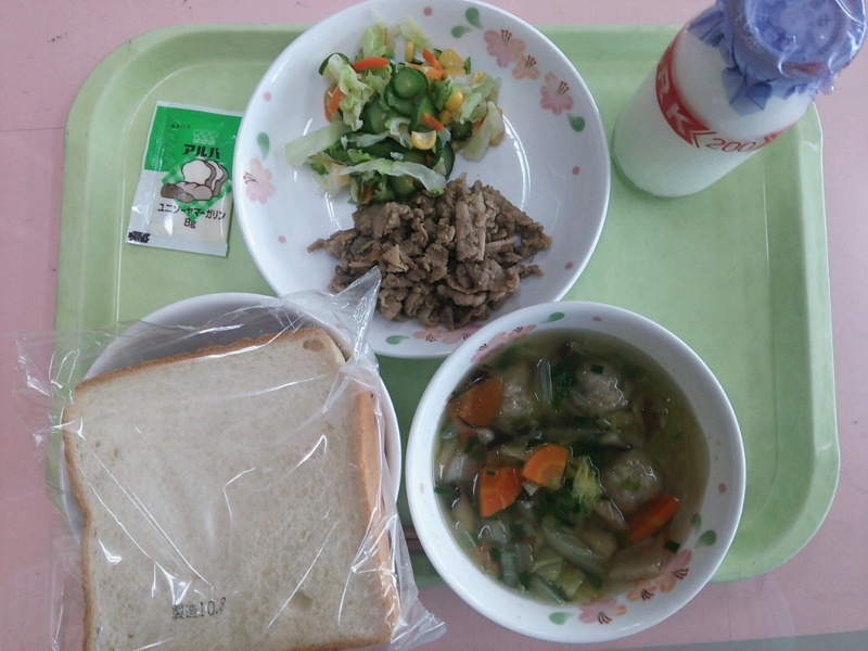 今日の給食は、台風の影響のため主食以外は、火曜日の献立に変更になっています。メニューは、「食パン、マーガリン、豚肉にりんごソース和え、キャベツとコーンのサラダ、ごぼう団子のスープ」です。組み合わせが、合わないところもあるかと思いますが、残さず食べてください。