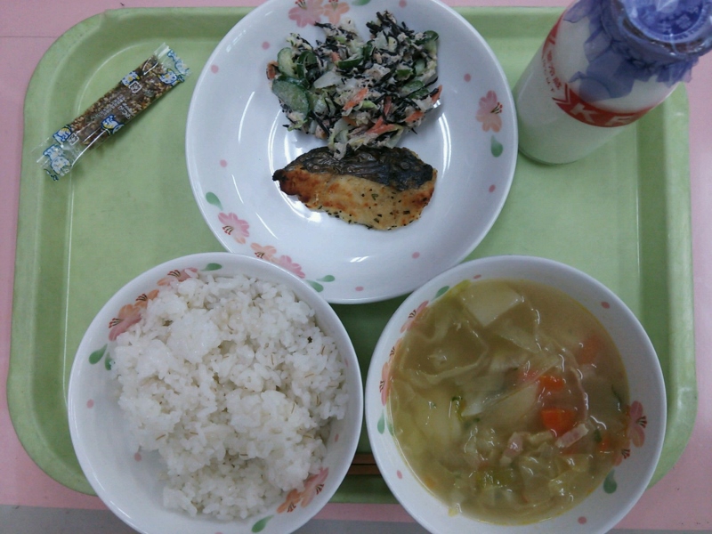 牛乳、むぎごはん、鰯のおろし煮、小松菜とひじきの和え物、豚汁