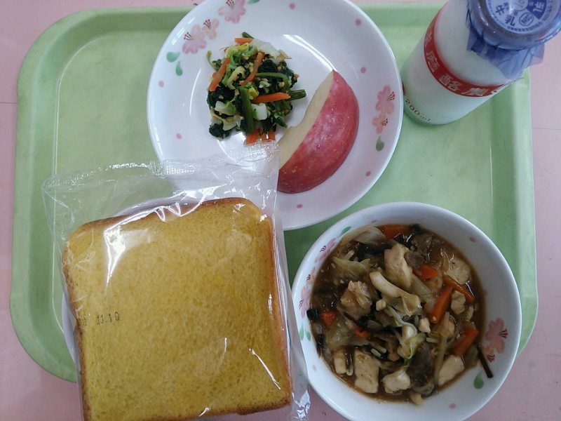 牛乳、かぼちゃパン、白菜のピーナッツ和え、豆腐の中華煮、りんご