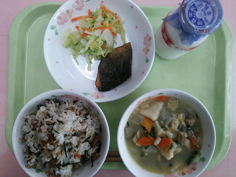 牛乳、ひじきごはん、しまホッケの塩焼き、キャベツの甘酢和え、団子汁