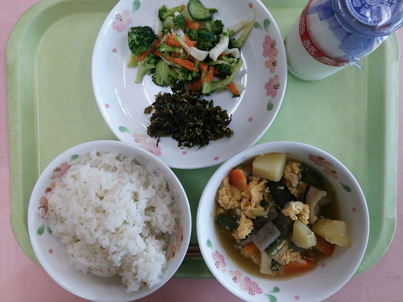 牛乳、むぎごはん、高菜の油炒め、イカとブロッコリーの酢の物、親子煮