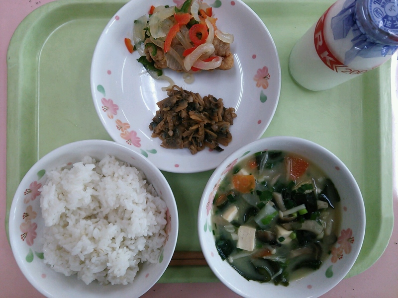 牛乳、むぎごはん、チキン南蛮、あさりのしぐれ煮、里芋の味噌汁