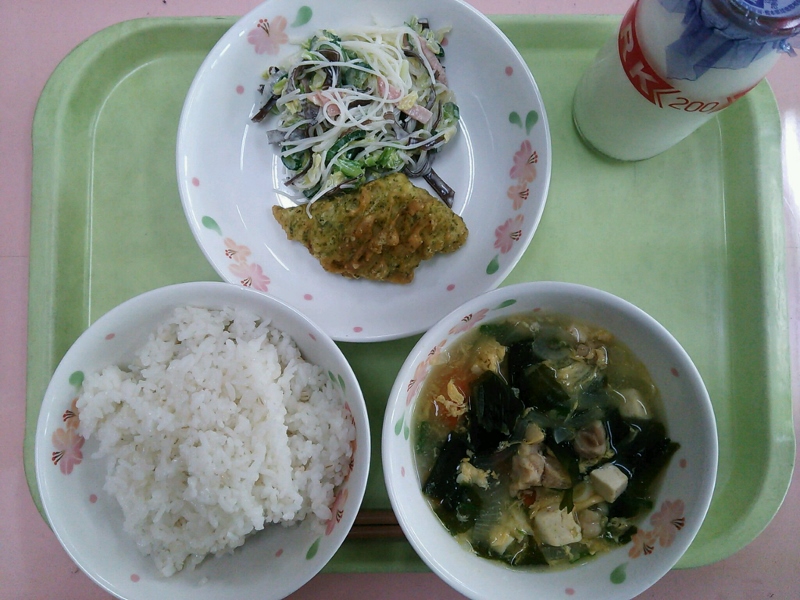 牛乳、むぎごはん、かき玉汁、白身魚のフリッター、ビーフンサラダ