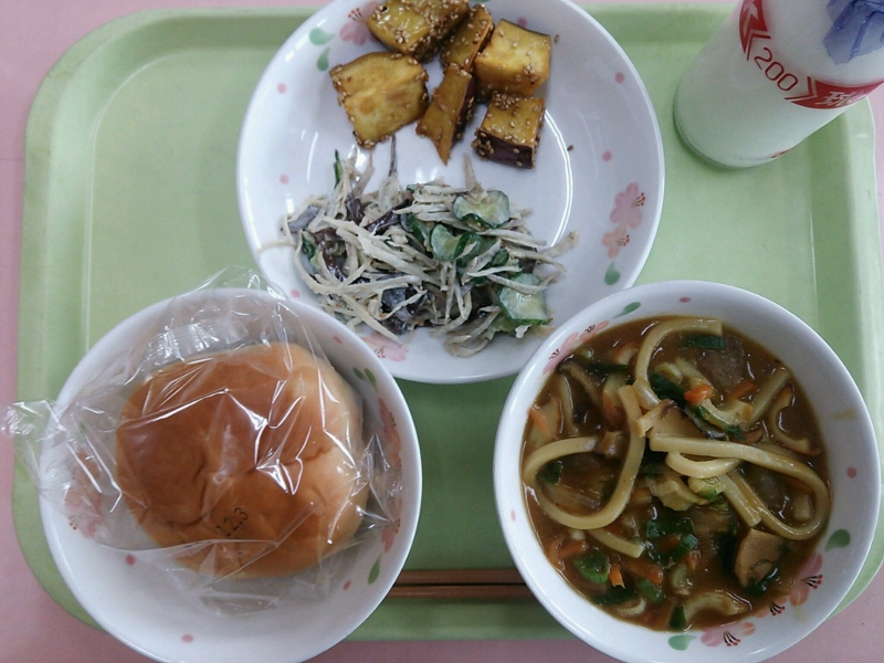 牛乳、パインパン、カレーうどん、カミカミサラダ、大学芋