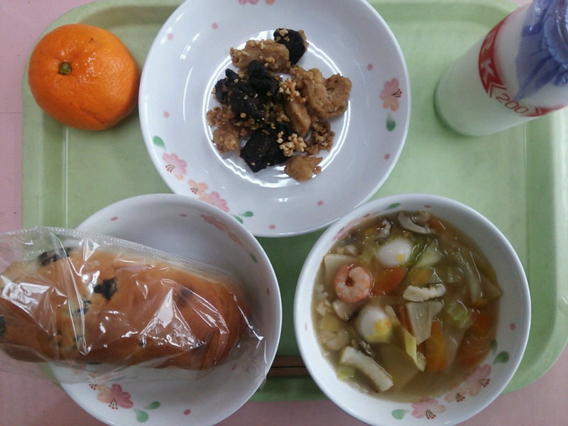 今日は、じゃが芋がたっぷり入ったみそ味で、少し甘めの煮物です。たくさんの材料が、合わさっているのでおいしく仕上がっています。食も進むと思います。きびなごは、カルシウムをたっぷり含んだ魚で、鹿児島や長崎で水揚げされたものです。油でしっかり揚げてありますので、頭たら尻尾まで残すことなく食べることができます。残さないように食べましょう。