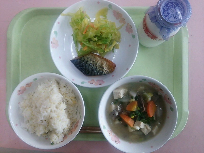 牛乳、さんごくめし、しし汁、サバの塩焼き、キャベツの甘酢和え
