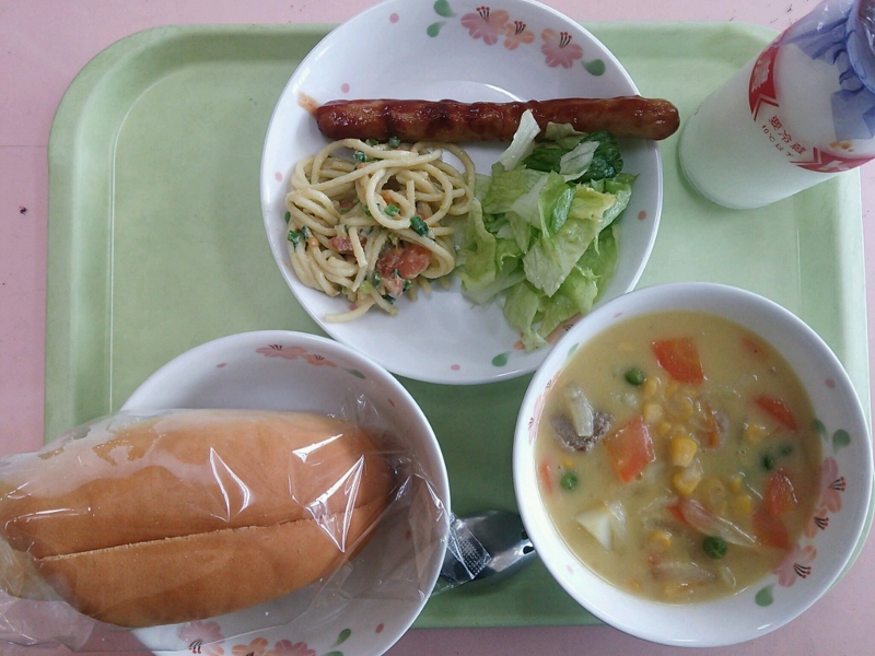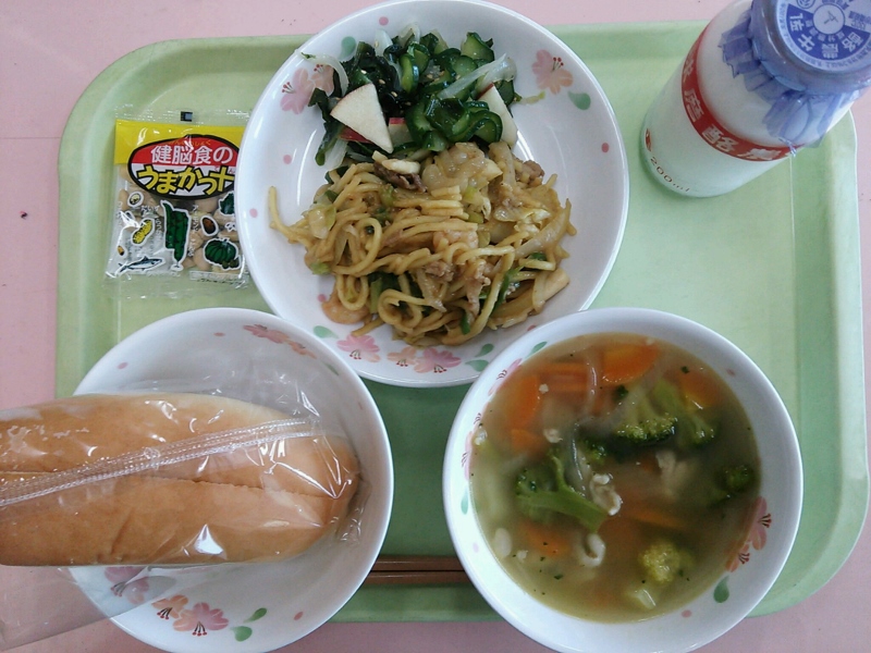 今日は、人気メニューの焼きそばを上手にパンにはさんで食べる、セルフ焼きそばパンです。焼きそばは、いかやえび・豚肉の旨味がよく出ていておいしく仕上がりました。他にも、野菜たっぷりのスープがありますので、残さないようにしっかり食べてください。