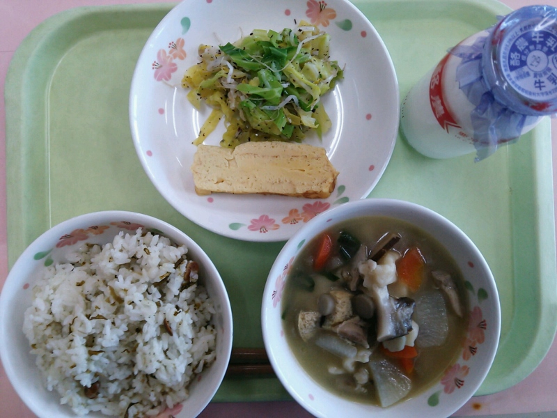 牛乳、かみかみたかなごはん、団子汁、厚焼き卵、キャベツのゆかり和え