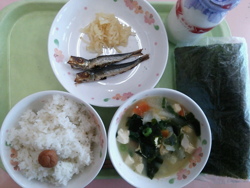 今日は、給食記念日です。給食が始まったころの食事を出しました。メニューは、セルフおにぎり、めざし、大根のみそ汁、漬け物です。毎日の給食は、調理員さんなど、多くの人によってつくられています。給食に携わってくれた人たちに、感謝をしながら食べてください。