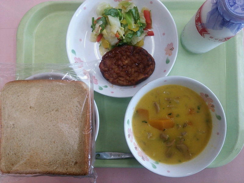 牛乳、黒糖パン、パンプキンシチュー、ハンバーグのケチャップソース、ミニサラダ