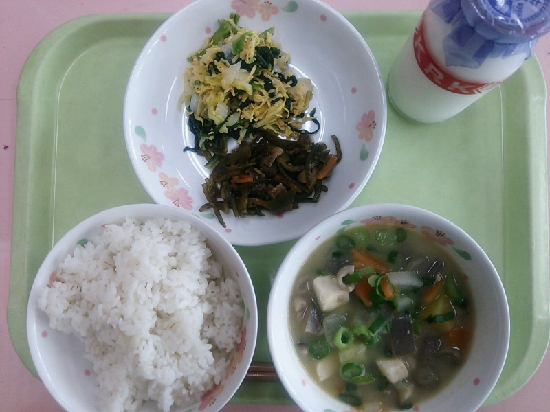 牛乳、むぎごはん、さつまじる、茎わかめのきんぴら、小松菜のごま和え