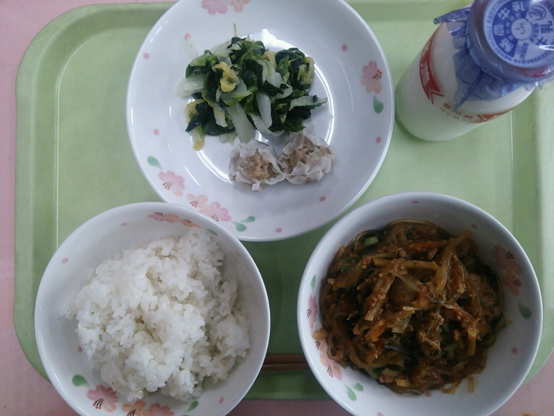 牛乳、むぎごはん、麻婆春雨、シューマイ、ナムル