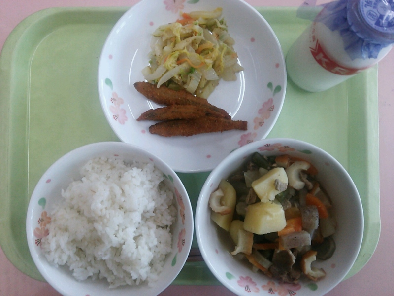 牛乳、むぎごはん、てっか煮、きびなごフライ、白菜漬け