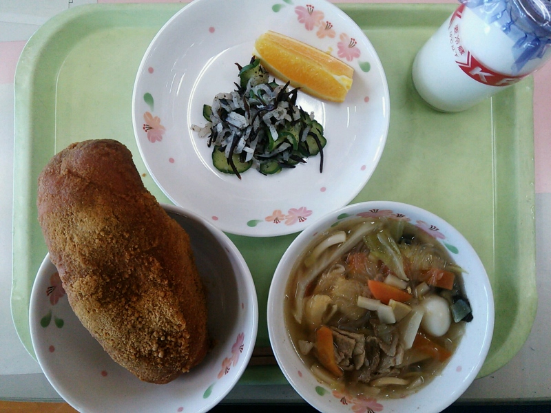 今日のパンはもちもちとした食感の「米粉パン」です。コロッケもありますので、はさんでバーガーにして食べてもいいかもしれませんね。スープは、ウインナーが入った「ミネストローネ」です。玉ねぎやキャベツ、トマトなどたくさんの材料が入ります。生のトマトを使っているので、さっぱりとした味に仕上がっています。残さないようにたべましょう。