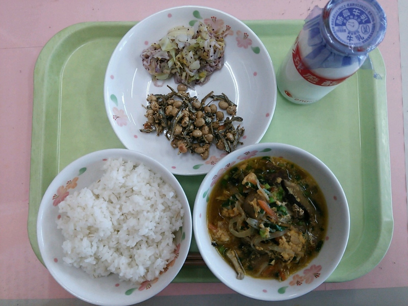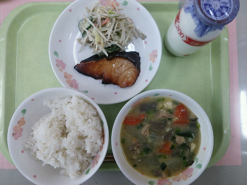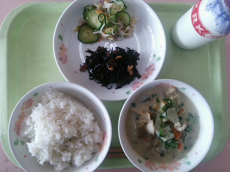 牛乳、むぎごはん、豆乳豚汁、ひじきのいり煮、もやしのごま酢和え