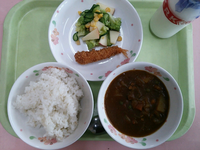 牛乳、むぎごはん、ポークカレー、エビフライ、カリフラワーサラダ