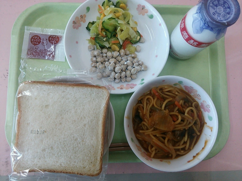 牛乳、食パン、イチゴジャム、スパゲッティーミートソース、キャベツとコーンのサラダ、大豆のりんかけ