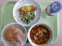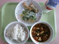 今日の麻婆豆腐は、ちょぴり辛めの味付けになっていますので、一年生は食べにくいかもしれませんがごはんは進むと思います。「バンサンスー」は、春雨が入った中華の和え物です。ごま油の風味がきいていて食欲をそそります。今日は、食が進み食べ終わるのが早いと思います。