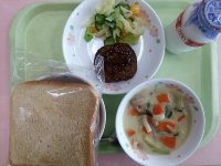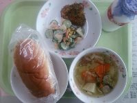 牛乳、ココアパン、ミネストローネ、豚肉のカレー焼き、じゃこサラダ