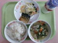 牛乳、麦ご飯、豚汁、塩鯖、ビーフンの酢の物