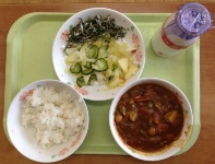 牛乳、麦ご飯、ポークカレー、いりこの青のり和え、グリーンサラダ