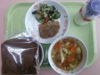 牛乳、ミルクパン、ポトフ、鶏肉のパン粉焼き、ブロッコリーサラダ