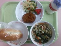 牛乳、ソフトフランスパン、山菜うどん、うまかコロッケ、キャベツのゴマ酢和え、いちご
