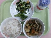 牛乳、麦ご飯、すき昆布のサラダ、枝豆、筑前煮