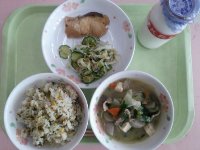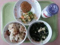 牛乳、麦ご飯、カリカリいわしフライ、きゅうりとわかめの酢の物、親子煮