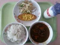 今日は、久しぶりの牛肉たっぷりの「ハヤシライス」です。牛肉は、人吉・球磨産を錦町の「チキョウミート」さんから納めてもらっています。また、カミカミメニューとして、ごぼうたっぷりのサラダを出しました。よく噛んで、あごの筋肉を鍛え、消化酵素のひとつでもある唾液をしっかり出しましょう。唾液をたくさん出すことで健康にもつながります。