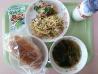 今日は、焼きそばをパンにはさんで食べる、セルフ焼きそばパンです。上手にはさんて食べましょう。サラダは旬の「トマト」を使った、夏向きのさっぱり味のサラダです。簡単ですので、お好みのドレシングを使ってお家で作ってみてください。トマトは日本では生で食べられることが多く、ビタミン類を多く含んでいます。そのためか昔から「トマトが赤くなると医者が青くなる」ということわざがあるほどです。今は、煮込み料理やソース、スープなど広範囲で活用されている食品です。今日も残さず食べましょう。