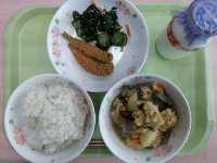 今日は、卵と鶏肉を入れた「親子煮」の中にサイコロ状に切った高野豆腐を加え、鉄分の補給が出来るように献立の工夫をしました。普段なかなか食べることのない食材で苦手な人も多いと思いますが、小さく切って卵と一緒に煮こむと食べやすくなります。カミカミメニューとして、いわしのカリカリフライもありますのでよく噛んで食べてください。