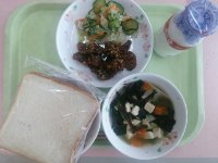 牛乳、食パン、豚肉のプルコギ、ちくわとキャベツのゴマ和え、豆腐のスープ