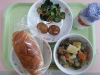 牛乳、ミルクパン、レンコン入りつくね、きゅうりとわかめの酢の物、鉄火煮