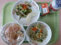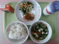 今日は、元気の出るメニューとして「豚肉のプルコギ」があります。豚肉には、みなさんもよく知っているように、疲れを取ってくれる働きのある「ビタミンB1」が多く含まれています。また、元気の素になるにんにくや抗菌作用のある生姜などを調味料に使ってあります。その他、サラダやスープにはたくさんの野菜やきのこが使ってあるので、しっかり食べることで体の中から元気にしてくれます。残さないように食べましょう。