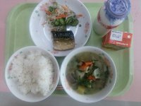 牛乳、麦ご飯、鯖の塩焼き、切干大根の酢の物、さつま汁、ジューシー