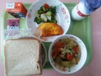 牛乳、食パン、マーシャルビーンズ、トマトオムレツ、なしサラダ、鶏肉と野菜のスープ煮、ジューシー