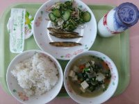 牛乳、麦ご飯、きびなごフライ、もやしの和え物、豚汁、ゼリー