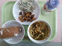 今日は、うるち米の加工品である「ビーフン」をサラダにしました。ビーフンは、うるち米の粉に水を加えたものを細い穴から押し出しためんです。色は、白く乾燥した状態で売られています。油で炒めたり、サラダなどにして食べられます。マヨネーズとの相性もいいので、今日はマヨネーズ味で作りました。よく噛んで残さないように食べましょう。