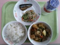 牛乳、麦ご飯、いわしの甘露煮、もやしのゴマ酢和え、肉じゃが