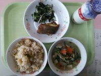 今日は、シーチキンと生姜を使った、少し変わた混ぜご飯です。生姜の香りと味がご飯によく合っているので、食が進むメニューです。今日の焼き魚は、「ほっけ」という魚です。北海道や東北でとれるます。開き干しで食べられるのが一般的ですが、和たちがよく口にする「かまばこ」の材料にも使われます。覚えておいてください。よく噛んで食べましょう。