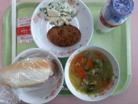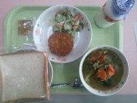 今日は、センター手作りの「ポテトサラダ」です。パンは、ソフトフランスパンですが、手で簡単にちぎることができます。お好みでパンに「ポテトサラダ」をはさんで食べてもいいです。また、お楽しみ給食として今年初の「ミルメーク」もあります。牛乳に溶かして飲みましょう。パン、スープ、ハンバーグ、サラダと牛乳を上手に交互食べをしてください。