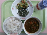 牛乳、麦ご飯、ポークカレー、五色和え、いりこの青のり和え
